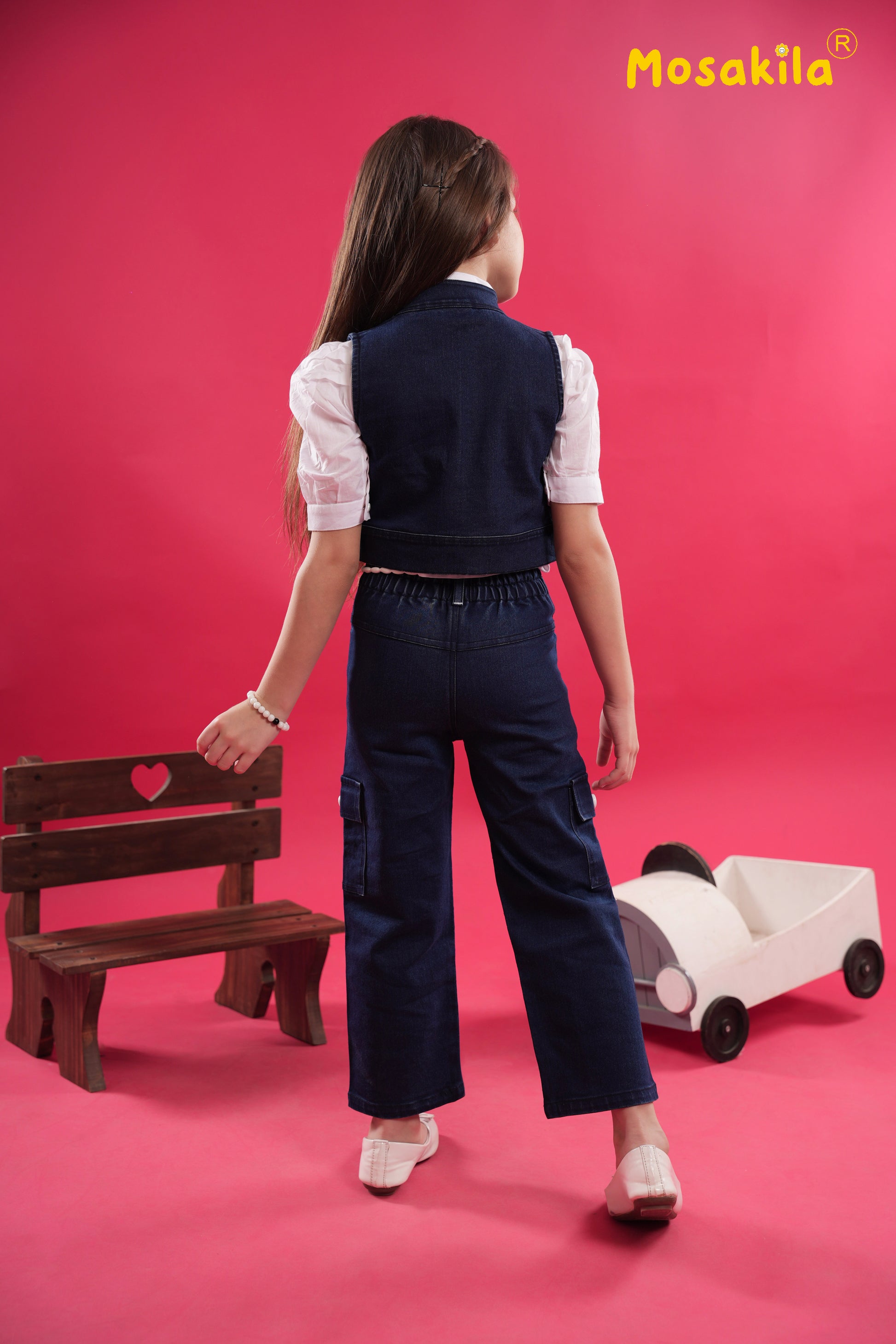 Stylish denim co-ord set for girls featuring a front-open vest, cargo pants, and cute rope belt detailing. Comfortable, trendy, and ideal for outings and special occasions.