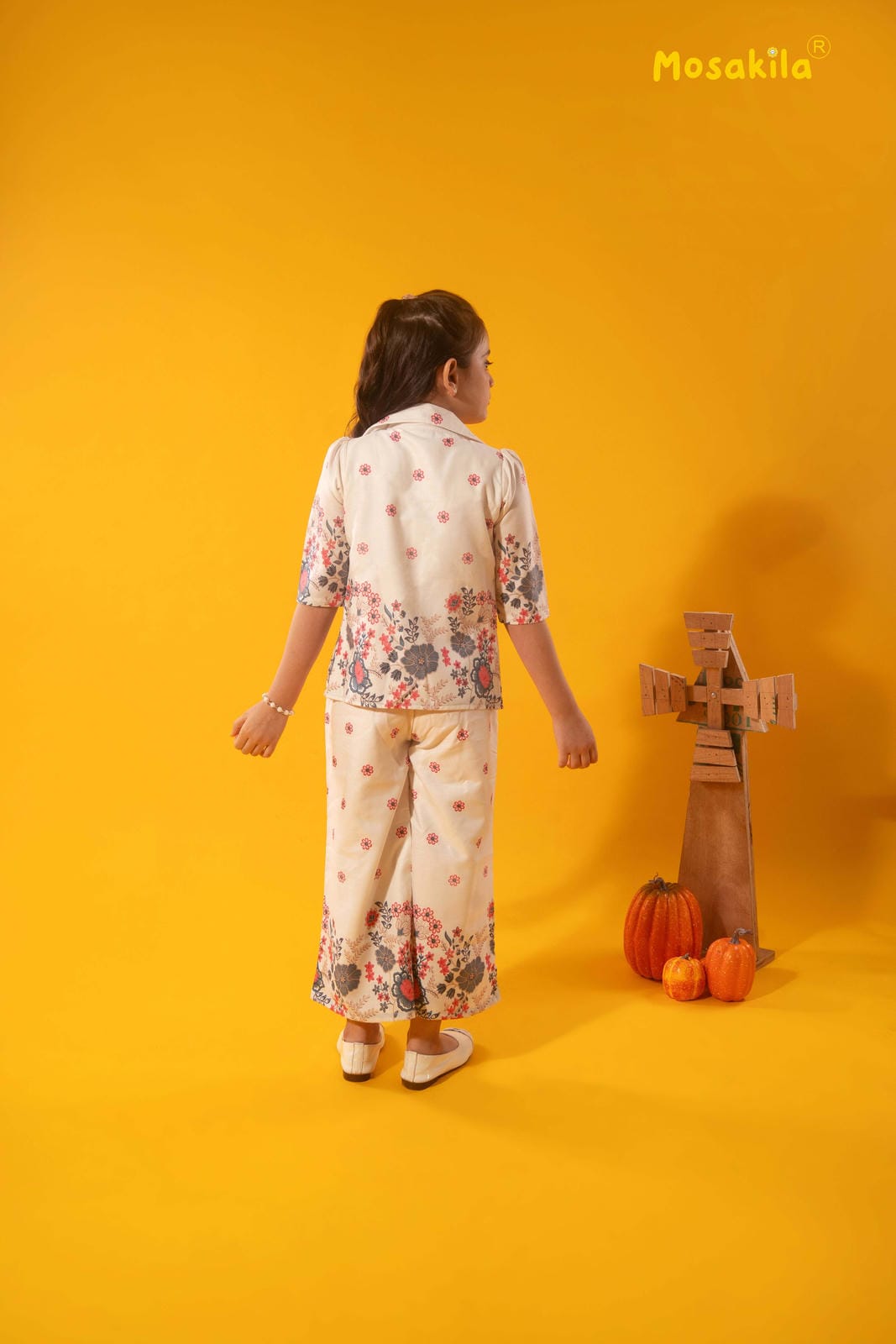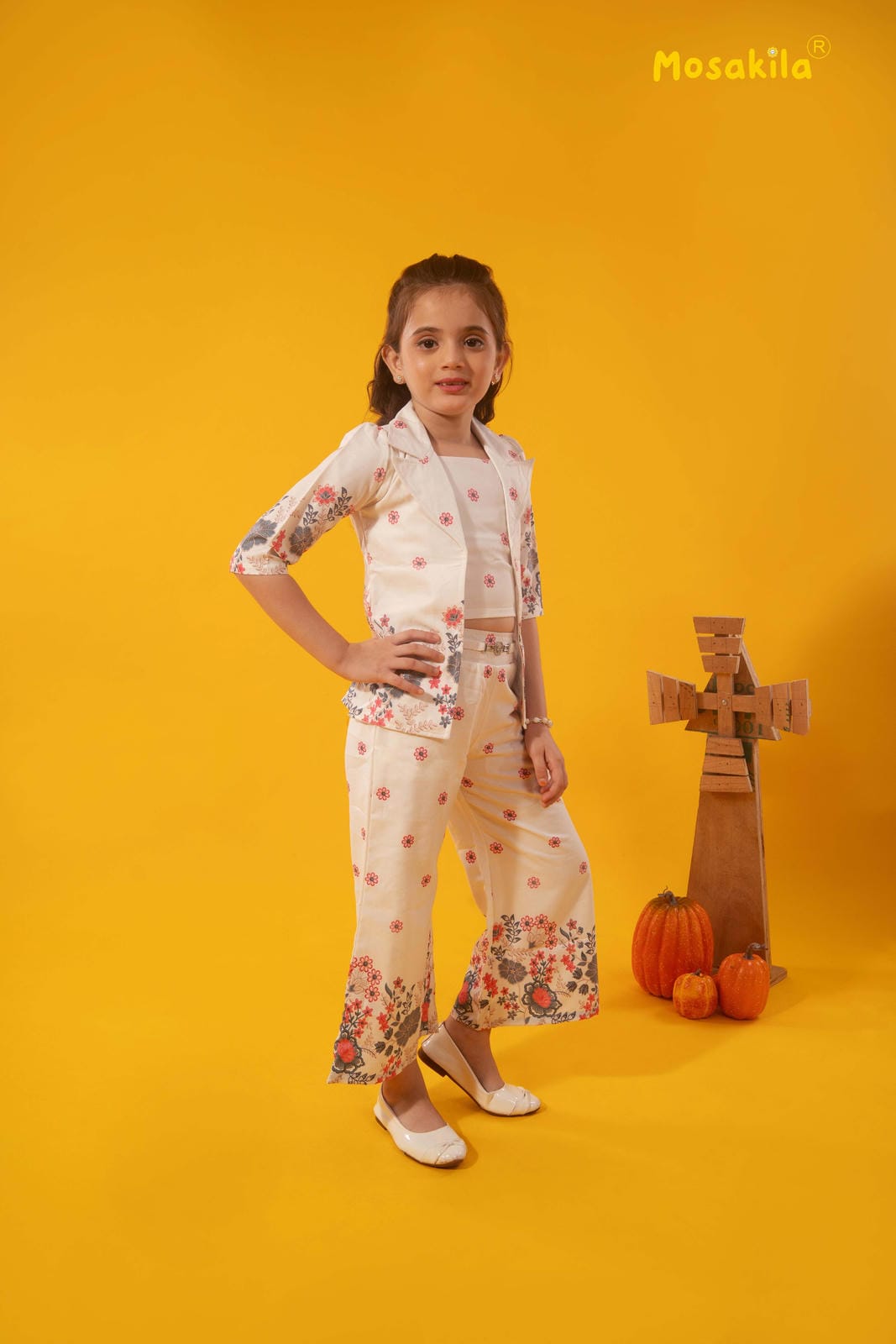 Soft, floral, and ultra-stylish — the Ivory Blossom Co-ord Set is a premium cotton outfit featuring a floral printed jacket, matching top, and wide-leg pants for an effortless festive and casual look.