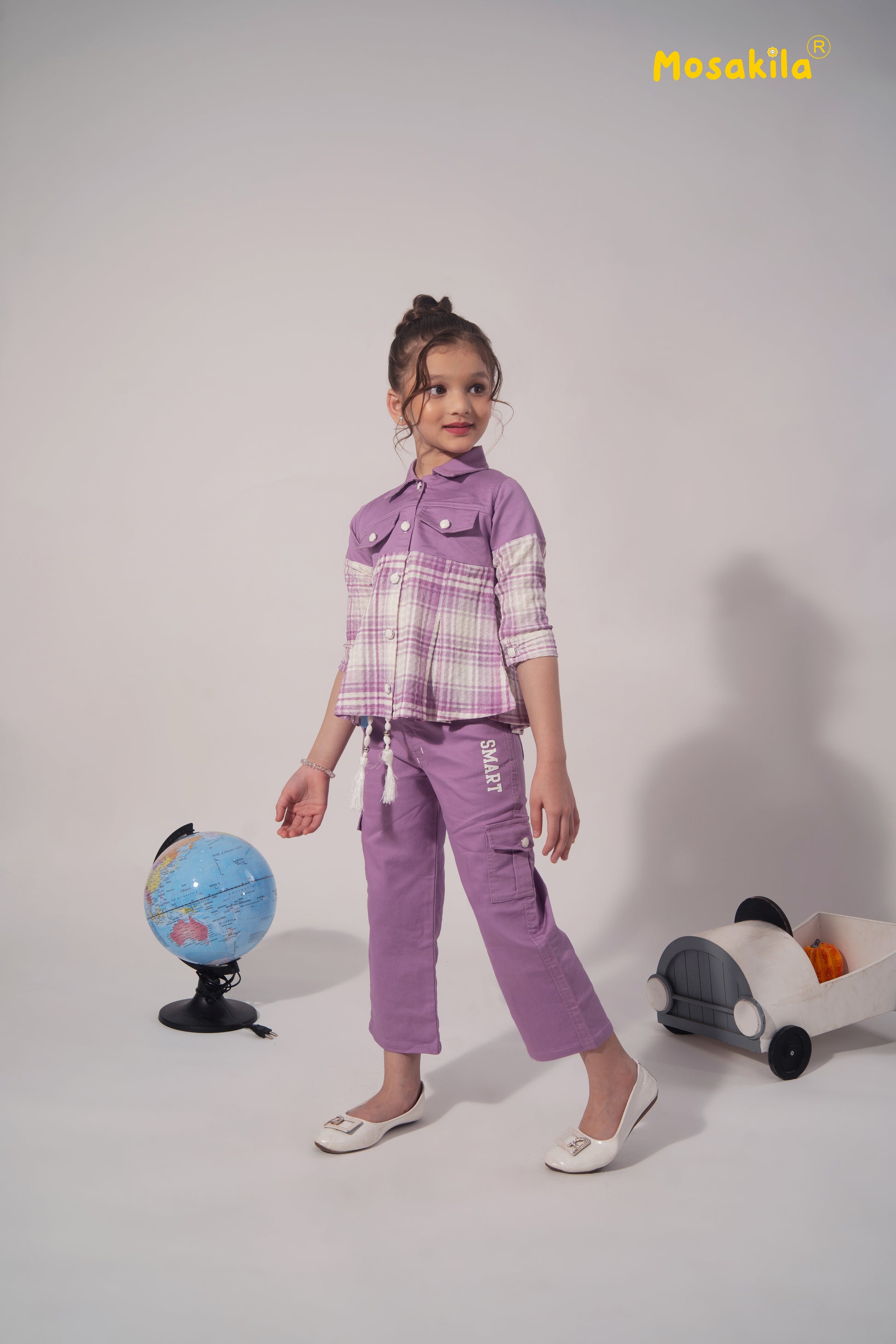 Stylish and comfortable, the Lavender Smart Co-ord Set features a checked shirt-style top with matching cargo pants — perfect for active, fashionable girls who love both comfort and trend.
