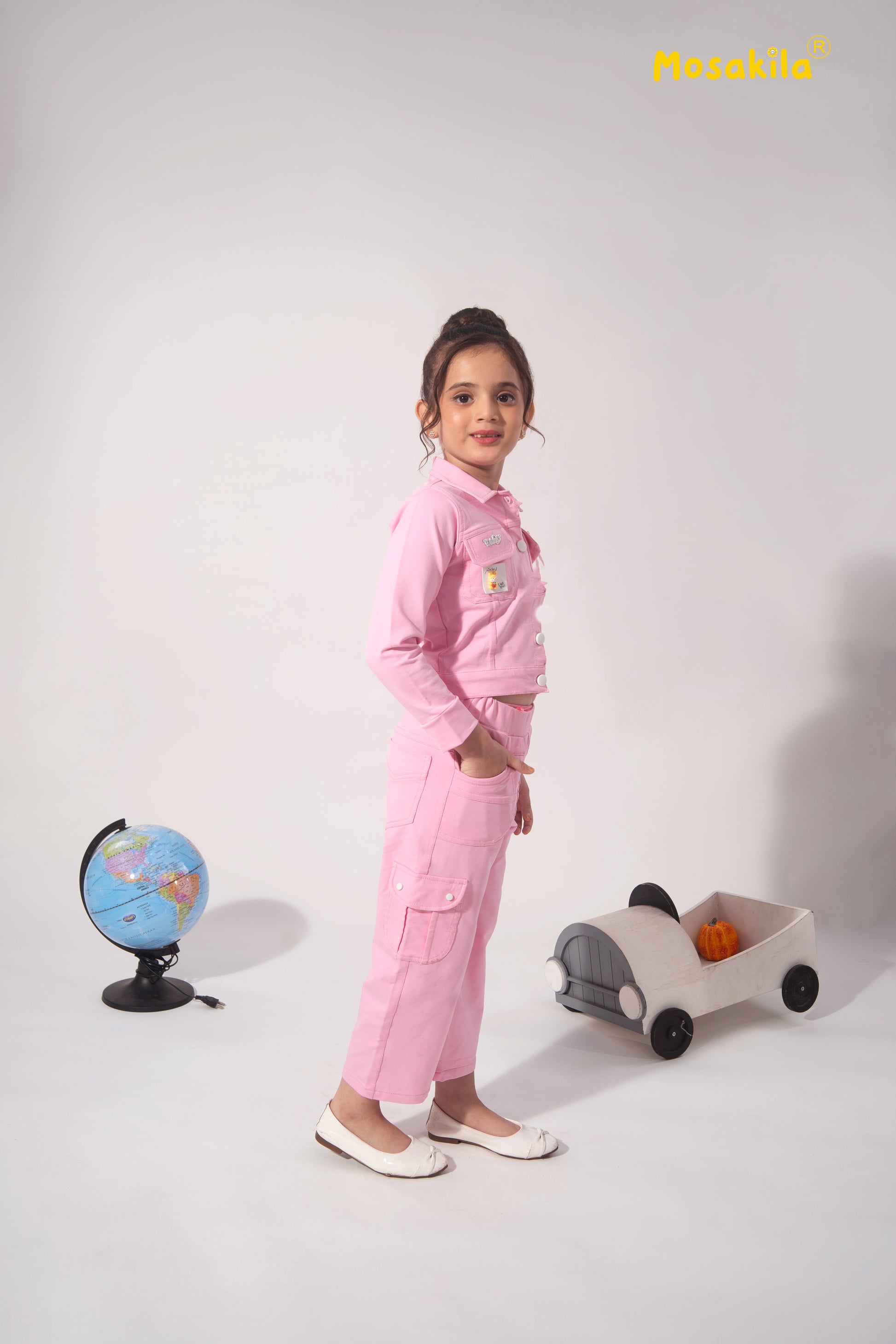 Let your little fashionista shine with the Rosy Candy Co-ord — a premium cotton 2-piece set designed for style, comfort, and confidence. Featuring a soft pastel pink jacket with cute bow embellishments and cargo-style pants, this outfit is perfect for outings, parties, special occasions, and everyday glam.